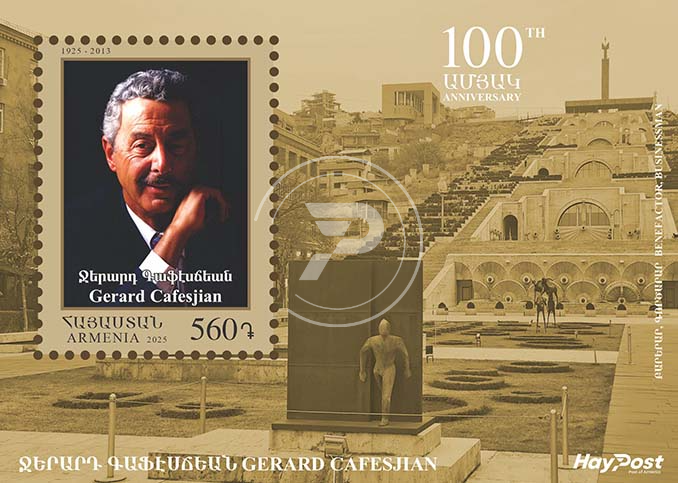 Timbrul postal de pe colita-suvenir cu valoarea nominala de 560 AMD îl înfatiseaza pe proeminentul om de afaceri armeano-american, binefacator, fondator al Centrului Cafesjian pentru Arte, Gerard Cafesjian (1925-2013).